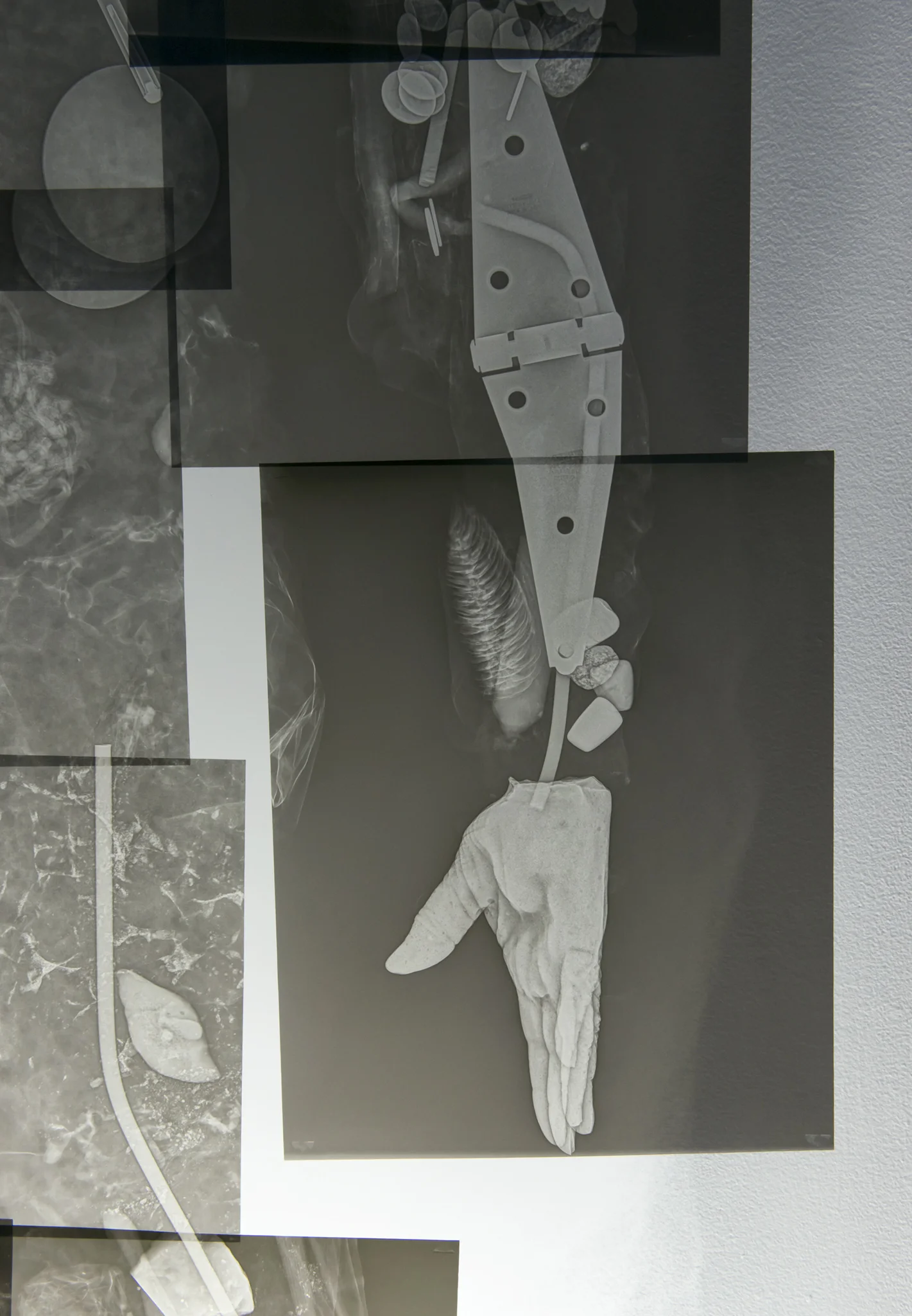 These works challenge our perception of sight—we are unable to see inside the corpse. However, Extra Rays provides the viewer with a key. This work is composed of a veterinarian size x-ray plate mounted on Plexiglas. Feyrer has put the corpse through an X-ray where we are able to see how Feyrer has substituted objects for organs. These two works explore how we perceive and evaluate the world, and ask the viewer to contemplate the difference between the physical body and human consciousness.
