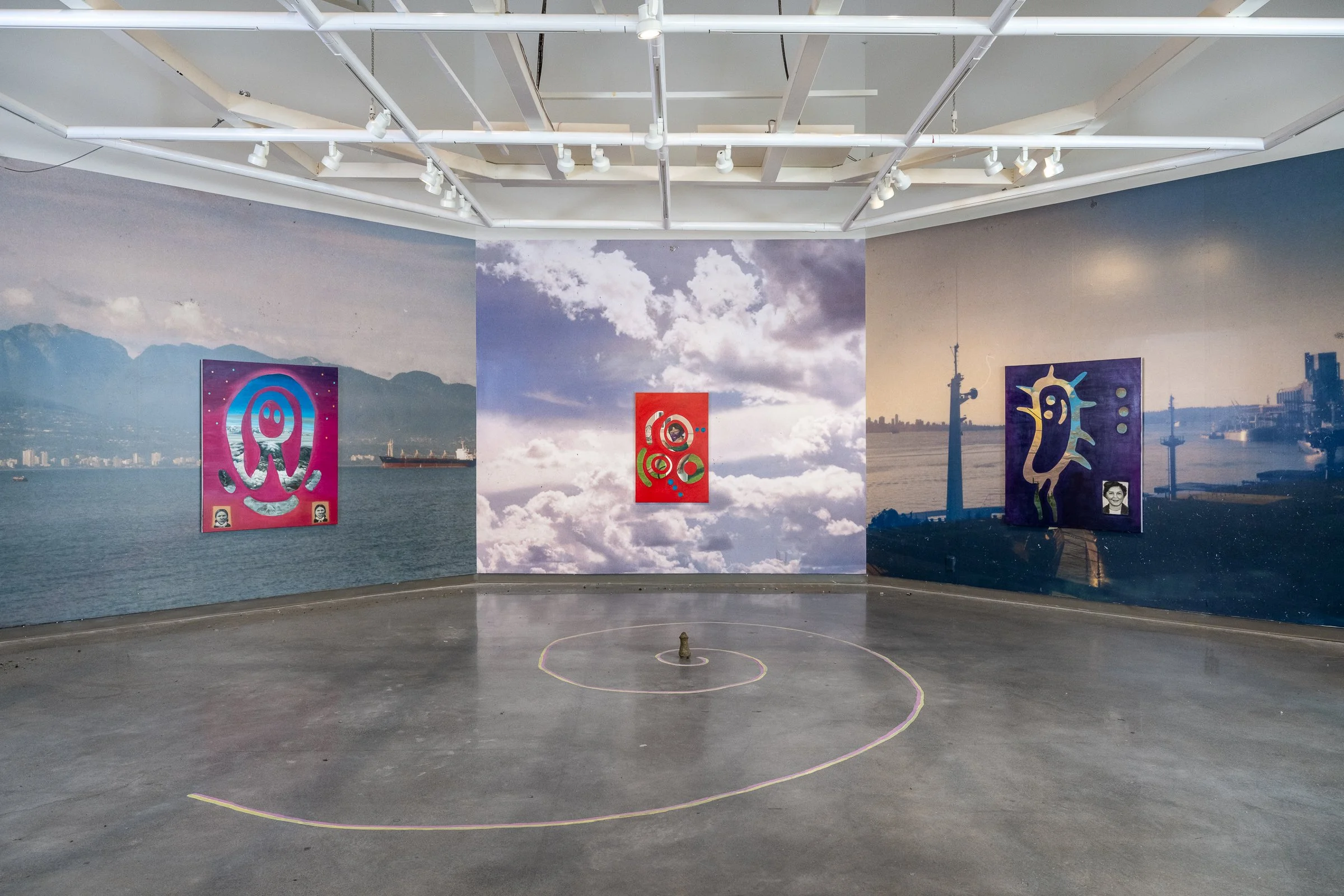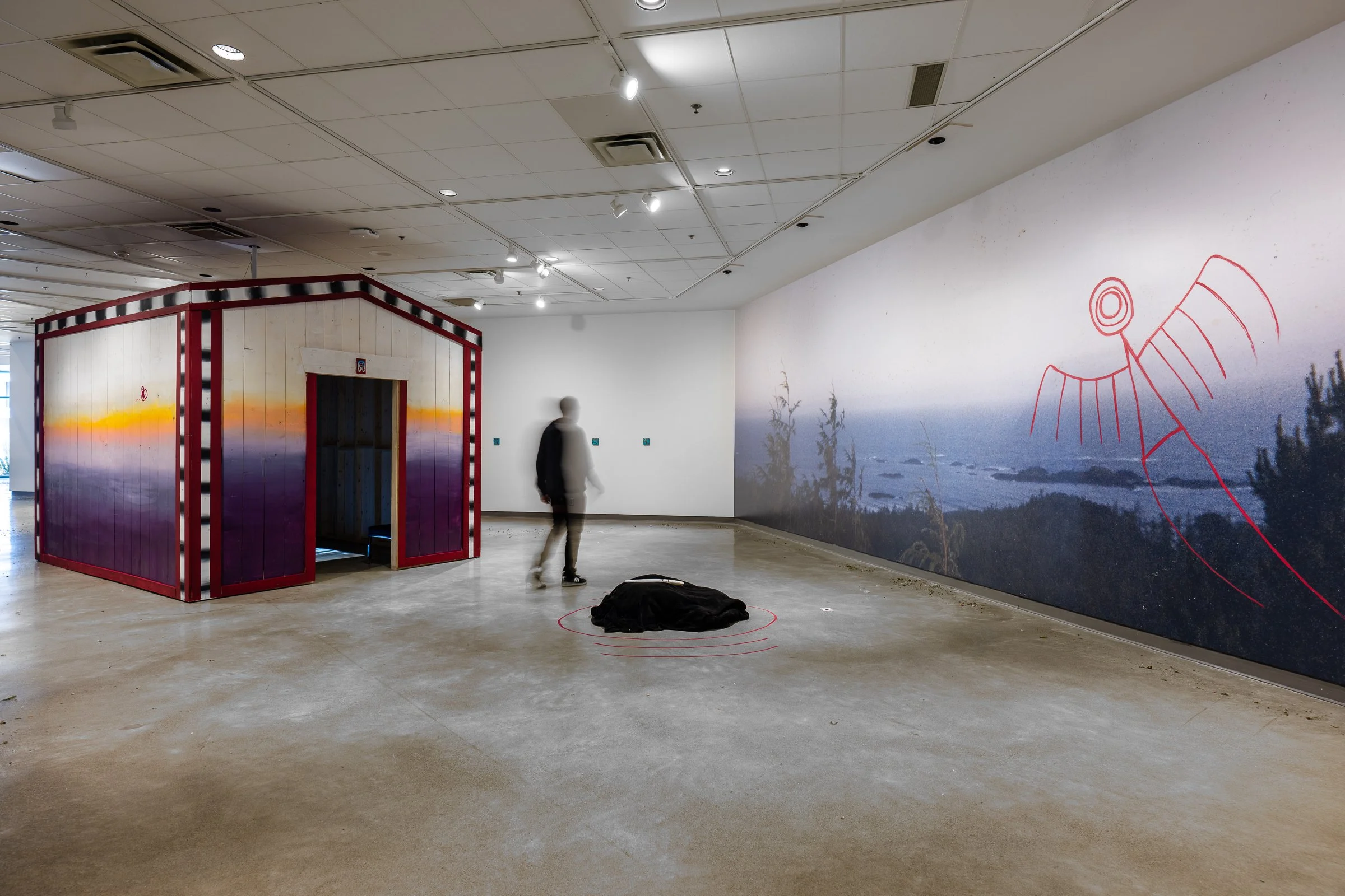 Manuel Axel Strain, xʷən̓iwən ce:p kʷθəθ nəw̓eyəł ((((Remember your teachings)))), 2025, Longhouse (wood, paint), mural, oil on canvas. Photo BY Michael Love Photography. IMAGE COURTESY OF THE RICHMOND ART GALLERY.