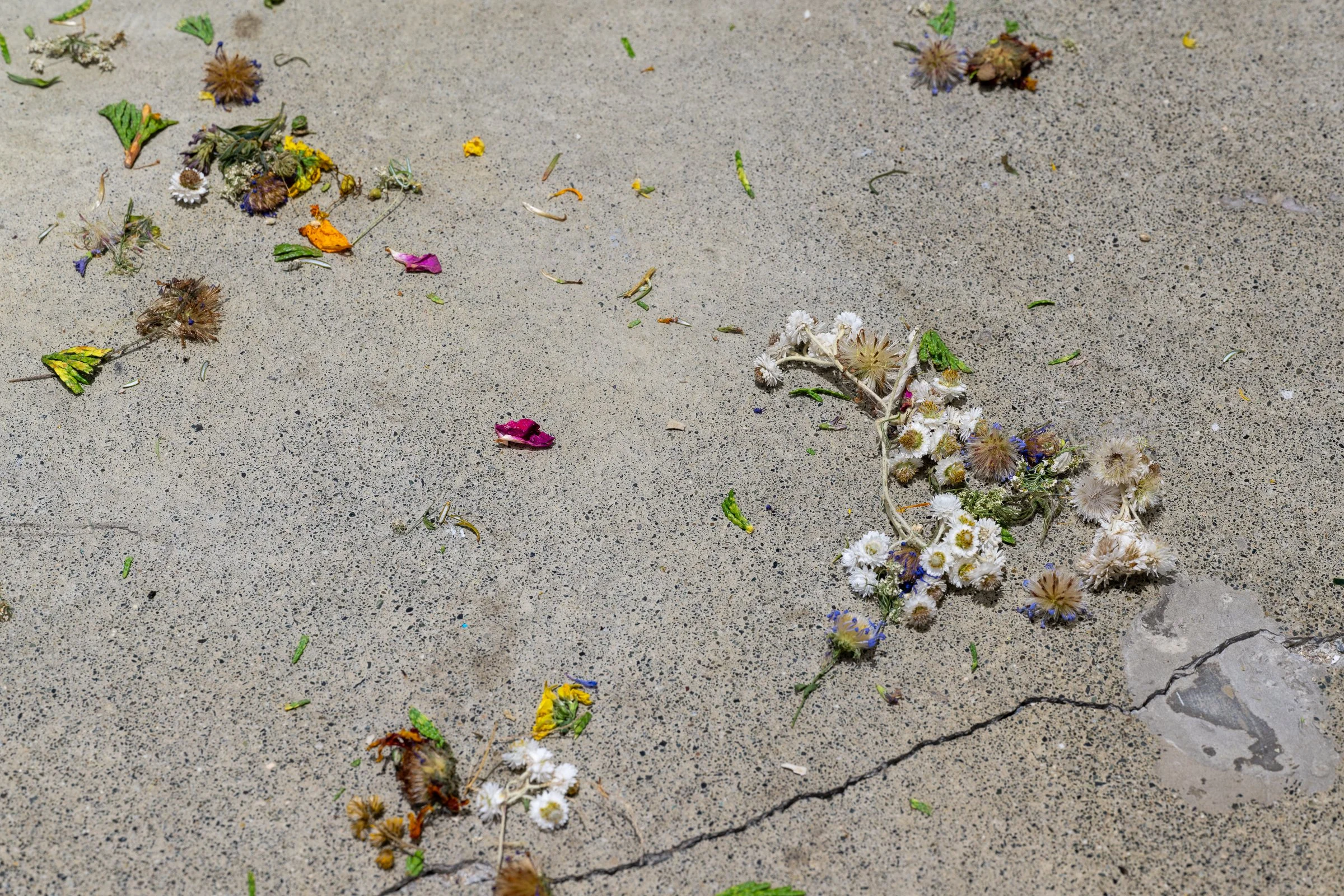 Detail view of Wildflowers (from witnessing ceremony at opening reception), Manuel Axel Strain, xʷən̓iwən ce:p kʷθəθ nəw̓eyəł ((((Remember your teachings)))), Richmond Art Gallery, 2025. Photo BY Michael Love Photography. IMAGE COURTESY OF THE RICHMOND ART GALLERY.
