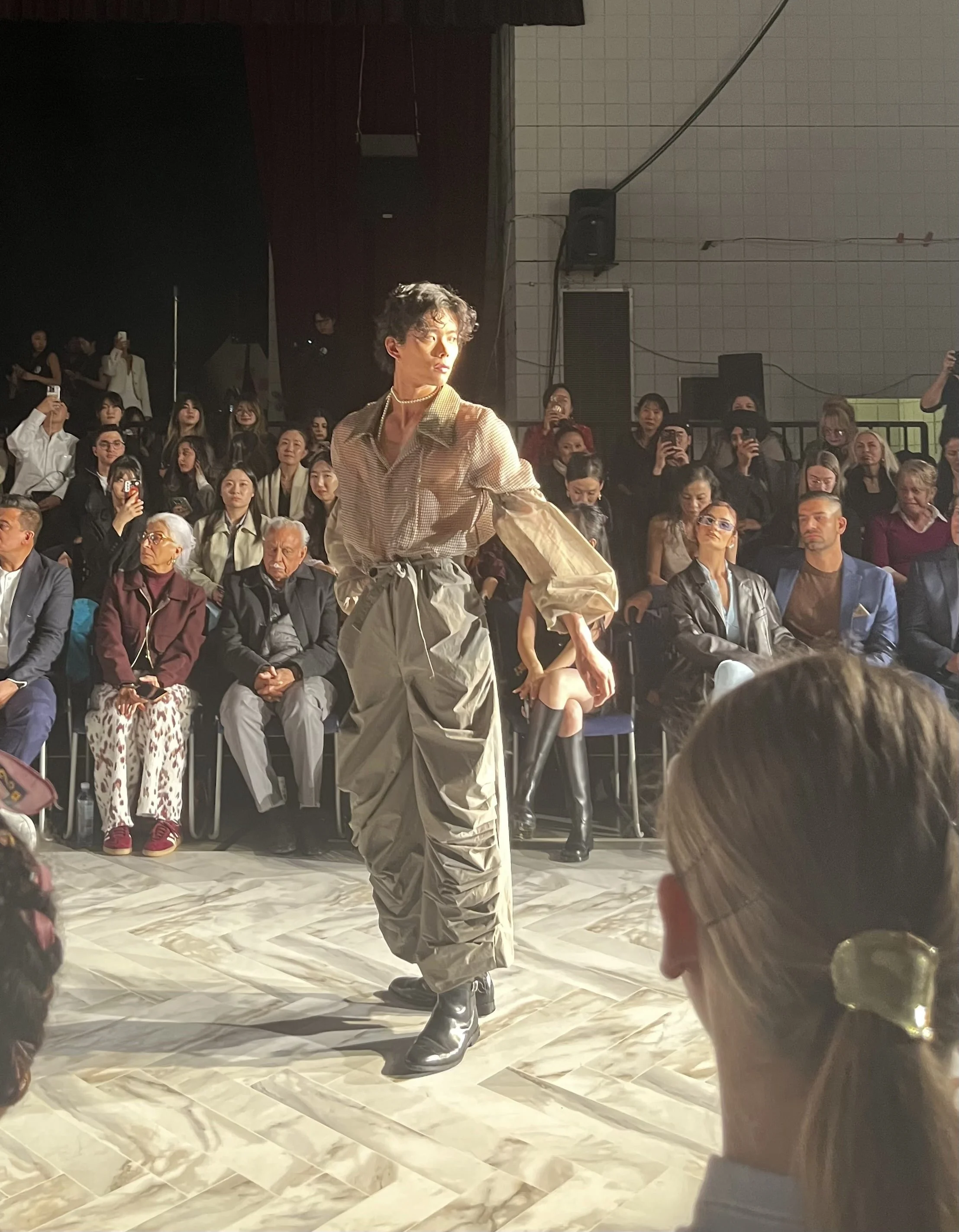 Hosted in David Lam Hall in the heart of Chinatown, the show opened with a line by Larissa Healey, a Two-Spirit, Anishinabe and Cree artist, often known by her alias Gurl 23. Nobody forgets the opener, and while that responsibility can come with a lot of pressure, Healey’s line BROKN AROW, traditional clothing with an upcycled twist, was just the opener the show needed. Healey has often spoken on the importance of upholding her culture’s traditions and values in her art, and her pieces reflected this beautifully in their ornate stitching and pops of gold, red and white. As a grass dancer herself, Healey weaves elements of Indigenous and Anishinabe garments into her contemporary pieces seamlessly.