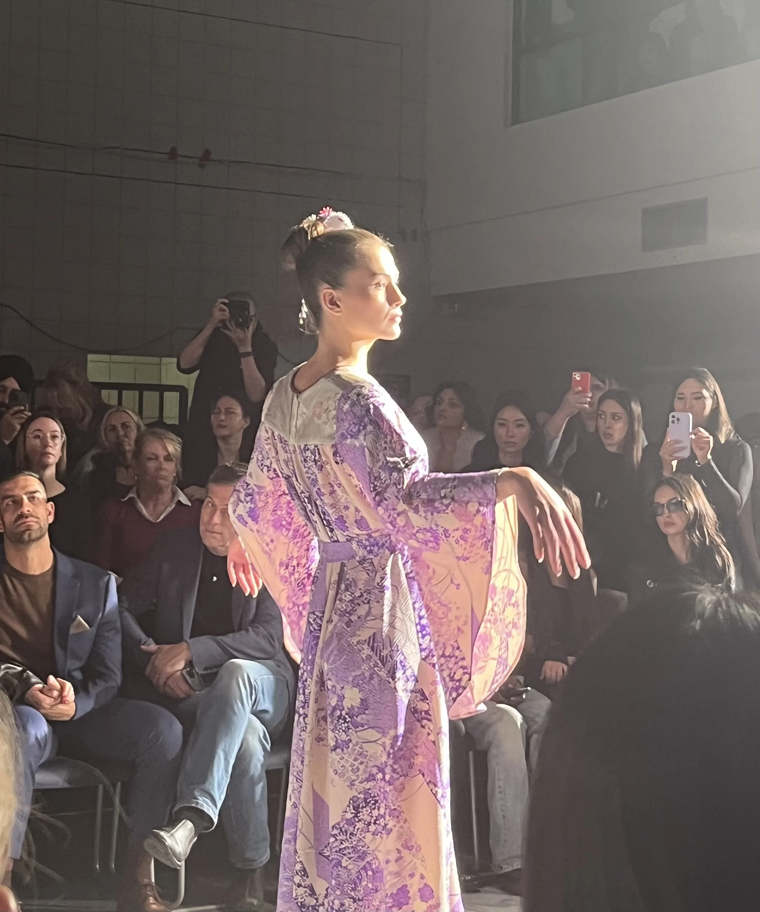 a model in a kimono from sonoko takeda’s nitenmon collection at vancouver fashion week s/s 26