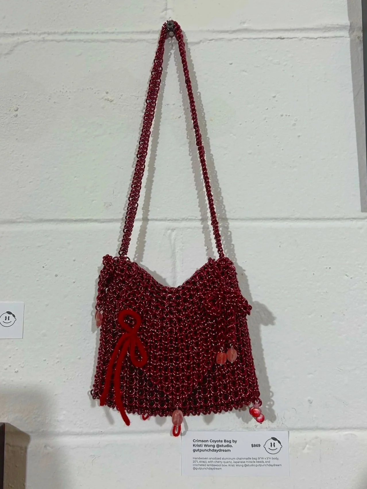 My jaw dropped when I saw Kristi’s piece. At first glance it looked small compared to the larger paintings and sculptures around it, but the closer I stepped, the more its detail revealed to me. Every link, every curve of the red metal revealed the kind of painstaking craftsmanship that goes into making a chainmaille purse. Taking around thirty hours of work using the coyote maille weave, Kristi freehanded the structure through a lot of experimentation.